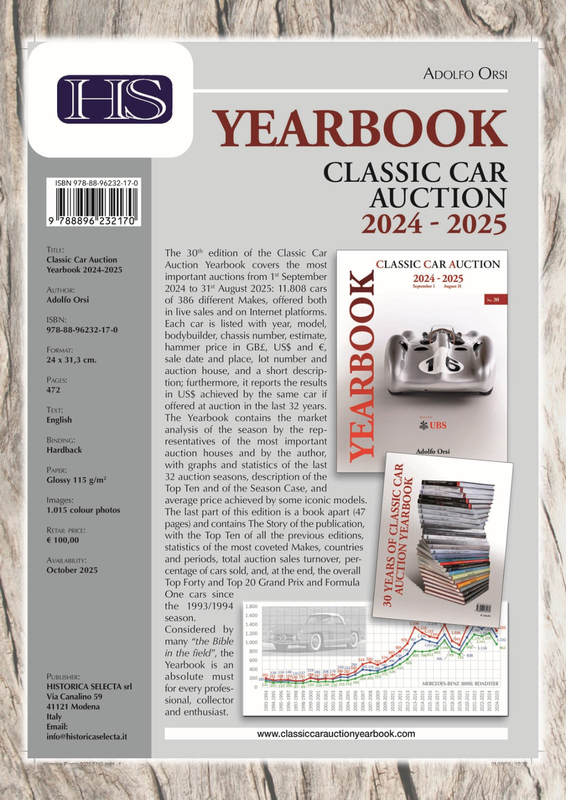 'This Classic Car Auction Yearbook 2024-2025' is considered to be the “Bible in the field” of the classic car circle.  This valuable Yearbook not only captures the full record of the auctioned cars of the year sorted by brands, but also illustrates the market trends and analysis of the major marker models in the field, along with the coverage of the Top 10 cases.  Over 1,000 colour photos are included in this 472-page hardcover book.  All enthusiasts and collectors must have one in hand!